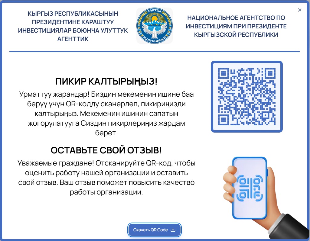 Кыргыз Республикасынын Президентине караштуу Инвестициялар боюнча улуттук агенттиктин QR кодун сканерлеп, өз пикириңиз менен бөлүшүңүз!